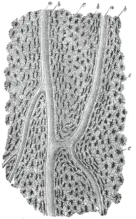 ![]() Section parallel to the surface from the body of the femur. X 100. a, Haversian canals; b, lacunae seen from the side; c, others seen from the surface in lamella, which are cut horizontally. | |