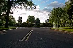The narrow streets of Ladd's Addition are lined with American Elm trees. The Save Our Elms organization inoculates the elm trees yearly against Dutch elm disease.[6] Each of the four smaller, diamond-shaped "circles" to the east, west, north, and south contains one of Portland's rose test gardens.[7] Friends of Ladd's Addition Gardens regularly solicits money and volunteers to maintain the rose gardens.[8] Ladd named most of the streets after trees, but he named SE Ladd Avenue and SE Elliott Avenue for himself and his wife, who was born Caroline Elliott.[9]