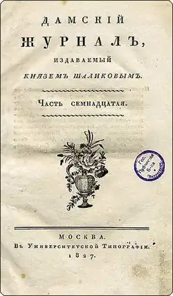 For the polemic with critics, the Anti–Journalism column was created – it was mainly led by Peter Shalikov and Mikhail Makarov.[9] In addition, in 1824, the publication provided its pages to Peter Vyazemsky,[10] who was excommunicated from almost all magazines, and who, after the publication of the Pushkin's "Bakhchisarai Fountain", entered into a literary polemic with the poet Mikhail Dmitriev. The discussion was initiated by Dmitriev in Herald of Europe; Vyazemsky's response was the articles "On Literary Hoaxes", "Analysis of the Second Talk, Published in No. 5 of the Herald of Europe" and "My Last Word", published in the Ladies' Magazine – they listed the "errors" of the opponent, and he was called "prose poet and non-art prose writer".[11]