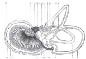 The lagena is part of the vestibular system in fish and amphibians. It contains the otoliths asterisci. In fish, the lagena is implicated in hearing and the registration of vertical linear acceleration,[1] in amphibians is the latter only.