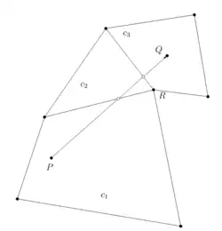Once the new particle position has been computed, the intersection between the particle trajectory and the cell's faces must be computed to deduce the particle's destination cell. If a particle's trajectory crosses a face, the particle is assigned to the neighboring cell. During a single time step, the particle can cross multiple cell faces; therefore, this step can be iterated several times.[19]