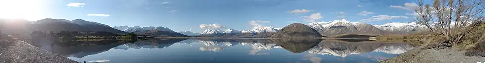 The surface elevation of the lake is 691 m (2,267 ft)[3] and it has a surface area of 695 ha (1,720 acres).[7] It is 40.5 km (25.2 mi) by road northwest of the small settlement of Mount Somers and is located in the upper catchment area of the Rakaia River.[2] The land surrounding the lake is mostly marshland and low hills, but Mt Sugarloaf (altitude 1,238 m (4,062 ft)) rises steeply from the north-eastern shoreline.[4][8] Mt Sugarloaf is an example of a roche moutonnée, a formation that has been shaped by the passing of a glacier.[9] It is listed by the Ashburton District Council in their District Plan 2022 as an Area of Significant Nature Conservation Value.[10]