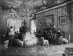 Ascending a flight of steps from these rooms, the observatory was reached, from which a fine view of the lake and the surrounding country was to be had. From the east end of the passage a door led into the courtyard, which was bricked, and in which the kitchen (a two-storied building) stood at the back of the house. Above the kitchen were the butler's apartments. Numerous other buildings filled the ground at the back of the residence. In the second entrance from the court yard stood a building of Gothic design, with a large clock over the entrance which proclaimed the hours. To this apartment the bachelors resorted in order to smoke, and for this reason it earned the name of 'bachelors' hall.' The homestead formed quite a village, with the abodes of the employees, carriage houses, stables, etc. The orchard contained an abundance of fruit, and a vineyard supplied grapes from which wine for the table was made. Visitors were constantly coming and going.”[5]