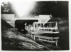 In the second decade of the 20th century, Ostróda shipowner Adolf Tetzlaff began to develop tourist boat services along the canal. His passenger fleet, which included vessels operating on Lake Ruda Woda, consisted of ships such as Seerose (Water Lily), Hertha, Heini, and Konrad. In the 1930s, Tetzlaff's company transported a total of 8,000 to 10,000 passengers.[21] In 1947, the company was nationalized and became the property of the Polish state.