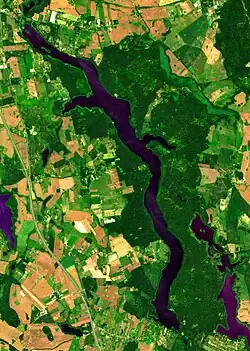 Two distinct, noticeably shallower bays can be found to the east and west of the main body of water. The western bay near the village of Sople contains three small islands. On the opposite shore of the western bay, where the former site once served to store and prepare wood for rafting, a scout camp has been established. The camp hosts annual sailing and scouting events. The eastern bay, known as Zatoka Drela (Drela Bay) or Żydowski Kąt (Jewish Corner), is where the lake's main tributary, the Drela River (German: Drehle), flows in. The name Żydowski Kąt (Jewish Corner) originates from wartime stories among the local population, which claim that the Jewish owner of a nearby inn and his family were drowned in the lake.[9] Stretching to the southeast, Drela Bay, together with the lake's main route, forms a peninsula known as Stańkowo.[10] In the southern part of the lake, two small bays extend northwest, where the village of Liksajny is located. The lake features seven uninhabited islands, the largest of which is situated in the northern part, opposite the village of Wilamowo.