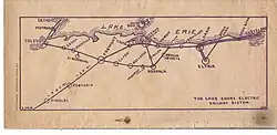 The LSE was formed in 1901 and was composed of four predecessor streetcar and interurban lines, all owned by the Everett-Moore Syndicate. The Lake Shore Electric operated a 60-mile route between Cleveland and Toledo. In 1907, the company constructed a cutoff between Sandusky and Fremont, Ohio, which reduced the distance between Cleveland and Toledo by five miles and decreased travel time by 30 minutes. The old and the new routes were operated with hourly passenger service where a two-car interurban from Cleveland separated at Sandusky and recoupled at Fremont to continue to Toledo. This service continued until 1939.[1]