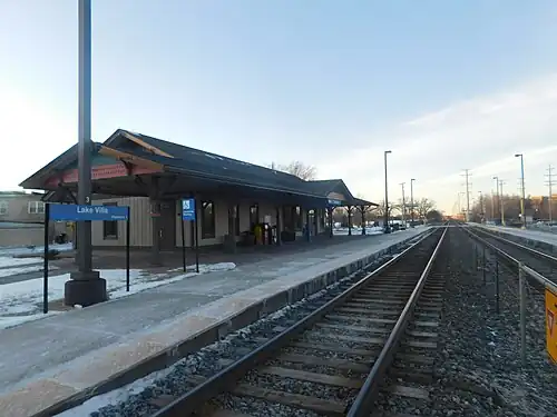 Lake Villa is a station on Metra's North Central Service in Lake Villa, Illinois. The station is 48.4 miles (77.9 km) away from Chicago Union Station, the southern terminus of the line.[3] In Metra's zone-based fare system, Lake Villa is in zone 4. As of 2018, Lake Villa is the 178th busiest of Metra's 236 non-downtown stations, with an average of 130 weekday boardings.[2]