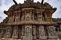 The decorative plan of the outer walls of the shrines and the mantapa (hall) is Hoysala style, with two eaves that run around the temple. According to art historian Gerard Foekema, the wall panel images (one hundred and forty in all), and the reliefs and friezes that abound in this temple have a relaxed quality of workmanship about them, and appear more "folkish in character".[13] Here, the first heavy eaves runs below the superstructure and all around the temple with a projection of about half a meter. The second eaves runs around the temple about a meter below the first. In between the two eaves are the miniature decorative towers (Aedicula) on pilasters. Below the second eaves are the wall panel of images of Hindu deities and their attendants in relief.[14] Below this, at the base are the six equal width rectangular moldings (frieze). Starting from the top, the friezes depict; hansa (birds) in the first frieze, makara (aquatic monsters) in the second, epics and other stories in the third (usually from the Hindu epic Ramayana, the Mahabharata, and stories of Krishna), leafy scrolls in the fourth, horses in the fifth and elephants in the sixth (bottom frieze).[10][15]