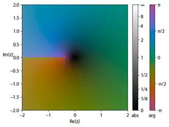 Main branch of the Lambert W function in the complex plane, plotted with domain coloring. Note the branch cut along the negative real axis, ending at .