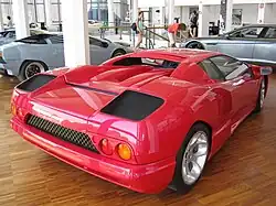 Introduced at the 1992 Geneva Motor Show, the Diablo roadster concept showcased what a possible open top version of the car would look like. The roof was removed and the car had a shortened visor in place of the windshield which made its way to the doors indicating the adaptation of the barchetta body style. The chassis was strengthened in order to compensate for the loss of the roof and the car featured many unique components some of which made their way to the later variants of the Diablo. Such components included larger air intakes near the rear wing and the sides of the car for better engine cooling, a visor mounted rear view mirror, roll bars over the seats, unique wheels in body colour of the car and a unique engine cover which included a tunnel in the middle for better airflow over the rear view mirror. The signature scissor doors were retained despite the loss of the roof and the interior became more ergonomic and featured a unique two-tone beige colour. The concept generated a positive response among the public and demand among customers for such a car. As the car was not intended for production, German tuner Koenig Specials, with Lamborghini's permission, converted customer cars into replicas of the concept. The cars featured different front and rear bumpers along with wheels than that of the concept due to copyright issues along with an upgraded engine. The conversion was no longer offered upon the request of Lamborghini as the company introduced the Diablo VT roadster in 1995.[7]