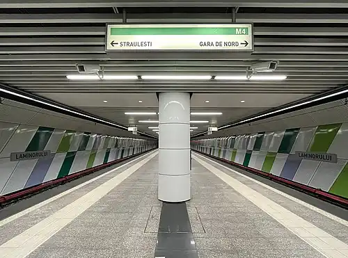 Laminorului is a metro station in northern Bucharest, serving Bucharest Metro Line M4. Although it was supposed to be opened on 19 December 2016 as part of Stage III of M4 line, Metrorex decided to postpone the opening until the first half of 2017, due to safety issues.[1][2] The station was opened on 31 March 2017 as part of the extension of the line from Parc Bazilescu to Străulești.[3] It is located at the former tram terminal Laromet on line 20, which was closed because of the metro line's construction.