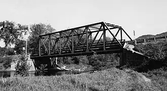 Prior to the present bridge, two bridges have stood at this site. The first was a covered bridge, known as the Tenney Covered Bridge, which was built in 1833, and was swept away in Vermont's devastating 1927 floods. The second bridge, an iron Pratt truss structure, was built by the Berlin Construction Company as part of a major effort by the state to rebuild its bridge infrastructure after the flooding. It was built using standardized guidelines for bridges of its length (111 feet (34 m)), and used rolled I-beams as a means to speed fabrication.[2] That bridge was closed and disassembled in 2007, and replaced by a temporary span.[3]