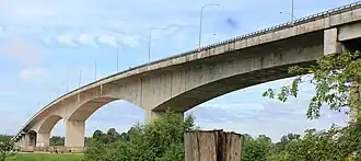 The Lanang Bridge, Sarawak State Route Q326, is a 1.2-km toll bridge in Sibu, Sarawak, Malaysia. It was constructed in 2003 by a local concessionaire, Woodville Development Sdn. Bhd., a subsidiary of Shin Yang Group, to replace the former river ferry service crossing the Batang Rajang.[1] The bridge, together with a series of states highways linking Sibu to Sarikei (Jalan Teluk Assan Q326, Jalan Tanjung Genting Q576, Jalan Kelupu Q206, Sarikei-Bintangor Highway Q345, and Sarikei-Pasi-Meradong Highway Q575), forms an alternative route for the Sarikei-Sibu section of the Pan Borneo Highway. Built at the total cost of RM 180 million, the bridge was opened to motorists on 11 April 2006.[2]