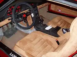 The Stradale's chassis was a space frame, similar to its rally counterpart, built out of CrMo steel tubes and aluminium alloy for the crash structures; it was covered by epoxy and fiberglass body panels. Like the rally car, the 1.8-litre four-cylinder engine was longitudinally mid-mounted, equipped with Weber-Marelli IAW integrated electronic ignition and fuel injection, a supercharger, a turbocharger and two intercoolers. In road tune the 1.8 produced 250 PS (184 kW; 247 hp)[9] at 6750 rpm and 291 N⋅m (215 lb⋅ft) of torque at 4500 rpm.[7] The "Stradale" kept a three differential four-wheel-drive system from the rally car; the centre differential sent 30% of the engine torque to the front open differential, and 70% to the rear limited slip. The transmission remained a 5-speed but was a fully-synchronized unit built by CIMA.[4][10]