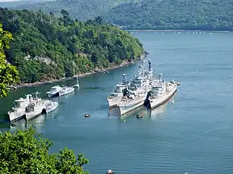 Shortly before entering the roadstead of Brest, the river Aulne forms a bend around the Île de Térénez then the pointe de Pen Forn near Landévennec, where there is a 10 m (33 ft) depth of water regardless of the tide and with the high surrounding hills blocking the winds and thus keeping the water calm. Here is sited a ship graveyard for civilian but particularly naval vessels. The only difficulty is the Capelan bank, to the south of Logonna-Daoulas, where the depth is less than 5 m (16 ft) - this bank has to be passed to reach the base and thus prevents very deep-draught vessels from reaching it.