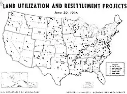 In 1933, a Special Board of Public Works composed of members from Federal departments recommended a program for purchasing farmland with damaged soil. In February 1934, the Agricultural Adjustment Administration launched the program. In 1934, the recommendation for the government to purchase and develop 75 million acres of such land was adopted. Starting in 1934, the government acquired 11 million acres of Great Plains land from private owners for $47.5 million. The land was turned into federally managed grazing land. The Land Utilization Program managed these lands. LUP seeded and managed the grassland for 10 years. Lands were used for pasture, forest, livestock, parks, recreation, and wildlife refuges. In total some 250 land utilization projects were created in 45 states.[2] Parcels were purchased under the Bankhead–Jones Farm Tenant Act of 1937, National Industrial Recovery Act of 1933, and the Emergency Relief Appropriation Act of 1935. The Resettlement Administration was established by Executive Order, in 1935. LUP was transferred to the Resettlement Administration, with an initial allotment of $48 million for land purchase and $18 million to employ labor for development. In 1937, LUP was under the Bureau of Agricultural Economics. In 1938, LUP joined the Soil Conservation Service.[2] In 1954 LUP moved under United States Forest Service where it remained until the program ended in 1964.[1][2][4]