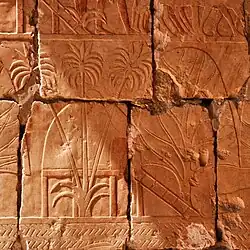 A report of that five-ship voyage survives on reliefs in Hatshepsut's mortuary temple at Deir el-Bahri.[24] Throughout the temple texts, Hatshepsut "maintains the fiction that her envoy" Chancellor Nehsi, who is mentioned as the head of the expedition, had travelled to Punt "in order to extract tribute from the natives" who admit their allegiance to the Egyptian pharaoh.[25] In reality, Nehsi's expedition was a simple trading mission to a land, Punt, which was by this time a well-established trading post.[25] Moreover, Nehsi's visit to Punt was not inordinately brave since he was "accompanied by at least five shiploads of [Egyptian] marines" and greeted warmly by the chief of Punt and his immediate family.[24][25] The Puntites "traded not only in their own produce of incense, ebony and short-horned cattle, but [also] in goods from other African states including gold, ivory and animal skins."[25] According to the temple reliefs, the Land of Punt was ruled at that time by King Parahu and Queen Ati.[26] This well illustrated expedition of Hatshepsut occurred in Year 9 of the female pharaoh's reign with the blessing of the god Amun: