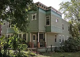 Erected in 1895,[1] the Landt Building is a residence featuring evidence of the transition in popular architectural styles occurring at the end of the century.[2] Its basic elements are ordinary: the walls are frame and topped with a flat roof, and the floor plan is a simple rectangle. Each of the house's sides is divided into four bays.[3] Both the front and the sides feature overhangs,[4] but the facade is markedly different from the other sides in its level of ornamentation. Placed on the side is a simple box-shaped structure on the second story only,[4] while two curved section, resembling shallow bay windows, project from the middle of the facade and rise from the ground to the roof. Each is pierced by three windows on each story, and the walls of the projections are partly covered with roofing shingles. Two main entrances are placed in the facade, one on each corner. The cornice is distinguished by a bed-mould of prominent dentils, architectural styling from a different period; the house is unusual for its mix of details from the Georgian style with components from the far later styles current in the 1890s.[3] Although originally built as a single-family residence, the Landt Building has since been converted into apartments.[1]