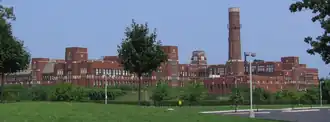 The west and rear of the school. The clock tower is visible to the right of center, and to the left of the taller smokestack.