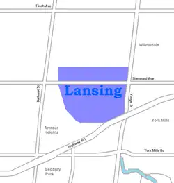 Lansing is a neighbourhood in Toronto, Ontario, Canada. It originated as a minor settlement of a store, other services, and a post office at the corner of Yonge Street and Sheppard Avenue, was later designated a postal village, and was finally consolidated with its fellow postal villages, Newtonbrook and Willowdale, into a new postal village named Willowdale within the Township of North York. For neighbourhood planning purposes, the City of Toronto, which North York was amalgamated into in 1998, labels Lansing as Lansing-Westgate. Its boundaries are Yonge Street to the east, Highway 401 to the south, Bathurst Street to the west, and Burnett Avenue to the north.