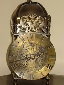 A lantern clock is a type of antique weight-driven wall clock, shaped like a lantern. They were the first type of clock widely used in private homes.[1] They probably originated before 1500 but only became common after 1600.[1] They became obsolete in the 19th century.
