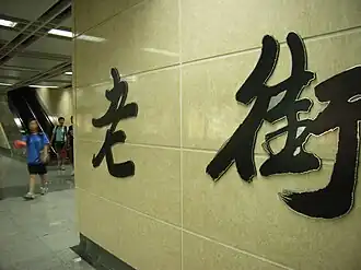 Laojie station (Chinese: 老街站; pinyin: Lǎojiē zhàn; Jyutping: Lou5 Gaai1 Zaam6; lit. 'Old Street station') is a station on the Shenzhen Metro. It provides cross-platform interchange between Line 1 and Line 3. The station is the busiest on the network with 61,600 passenger entries and exits a day.[2] The Line 1 platforms opened on 28 December 2004 and the Line 3 platforms opened on 28 June 2011. It is located underneath the junction of Shennan Fudao (simplified Chinese: 深南辅道; traditional Chinese: 深南輔道), Jiefang Road (解放路) and Jianshe Road (建设路; 建設路) in the Luohu District of Shenzhen, China. The station is the closest to the Dongmen Business Area (东门商业区; 東門商業區), one of the oldest areas in Shenzhen established in the Ming dynasty.[3]