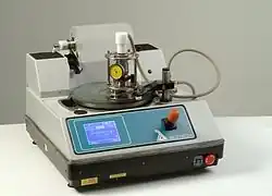 When there is a requirement to lap very small specimens (from 75 mm (3 in) down to a few millimetres), a lapping jig can be used to hold the material while it is lapped (see Image 3, Lapping machine and retention jig). A jig allows precise control of the orientation of the specimen to the lapping plate and fine adjustment of the load applied to the specimen during the material removal process. Due to the dimensions of such small samples, traditional loads and weights are too heavy as they would destroy delicate materials. The jig sits in a cradle on top of the lapping plate and the dial on the front of the jig indicates the amount of material removed from the specimen.