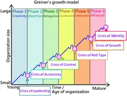 In 1972, Greiner proposed the Greiner's growth model, using five key concepts: the age of the organization, the size of the organization, the stage of evolution, the stage of revolution and the growth rate of the industry. Divide it into six phases (Only five phases when proposed in 1972, and a sixth phases was added in 1998), and proposed two key concepts: Evolution and Revolution.[3] This directly illuminates how organizations overcome growth crises, while their respective resolution strategies form the basis for re-emerging crises.