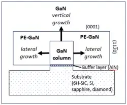 - ^ a b Zheleva, Tsvetanka S.; Nam, Ok-Hyun; Ashmawi, Waeil M.; Griffin, Jason D.; Davis, Robert F. (2001-02-01). "Lateral epitaxy and dislocation density reduction in selectively grown GaN structures". Journal of Crystal Growth. 222 (4): 706–718. Bibcode:2001JCrGr.222..706Z. doi:10.1016/S0022-0248(00)00832-0. ISSN 0022-0248.