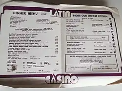 The two page menu had a variety of American styled selections intended to attract the crowd seeking entertainment excitement, as well as the large groups for banquets or a grand place for various celebrations. On page one of food and listed on the left hand page were six headings that included nine appetizers, two soups/salad, 12 entrees (including lobster and steaks), vegetables, six desserts, and three Beverages (no soda), with a final comment by the management: "May we suggest an after dinner drink?" On the right hand page of the menu was a section titled, "From Our Chinese Kitchen," which offered 13 oriental entrees and several side dishes. A final item ending this page outlined in a long rectangle was a special menu selection of a “Complete Polynesian Dinner”.