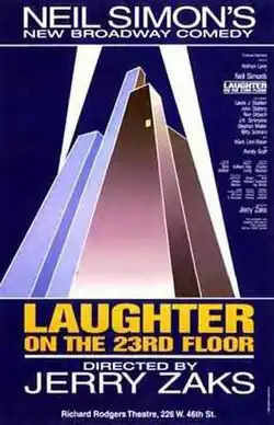 Laughter on the 23rd Floor opened on Broadway at the Richard Rodgers Theatre on November 22, 1993[4] and closed on August 27, 1994 after 320 performances and 24 previews. Directed by Jerry Zaks the cast featured Nathan Lane (Max), Ron Orbach (Ira), Randy Graff (Carol), Mark Linn-Baker (Val), Bitty Schram (Helen), J. K. Simmons (Brian), John Slattery (Kenny), and Lewis J. Stadlen (Milt).[4][5] The play was first performed at Duke University.[6][7] Stephen Mailer played Simon's young stand-in Lucas.