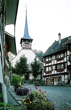 Until the 15th Century Laupen was an important stage on the east–west road between Bern and Fribourg. As the Sarine and Sense rivers could only be forded at the low water, Bern built a bridge across the Sarine in 1324. The bridge was often destroyed in floods and after the construction of the Sense bridges at Gümmenen by Bern in 1450 and at Neuenegg by Fribourg in 1467, it was not rebuilt. The small bridge over the Sense at the town gate only served local traffic. Without convenient trade routes, the town remained stagnant. The poverty of the population and the resulting low construction activity helped to leave the old town almost untouched. This consists of two full rows of houses dating from the 16th and 17th centuries and a church around a triangular market plaza. After the partial demolition of the fortifications (1847–70) only parts of the curtain wall and the Freiburgtor (Fribourg gate), from the 15th century, remained. In 1784 Laupen had 42 town houses, some of which were in front of the wall.[3]
