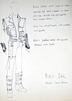 Greenan worked with Billy Idol to introduce a "Road Warrior" look to his stage persona inspired by the 1981 film Mad Max 2.[13] Working closely with the artist she adapted elements from the designs of Norma Moriceau whose hybrid costumes in the film influenced rock performances and street fashion throughout the early 1980s.[9] Her brief from Rob Halford of Judas Priest was to make him appear more aggressive within the established Heavy Metal look of the group, and her research included being flown to Paris to watch the band perform. She introduced widened shoulders and a sharper line to Halford's costume, retaining the use of real leather loaded with extensive metal studwork.[2]