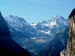 The Lauterbrunnen Wall is a term used in the English-speaking mountaineering world[1] to refer to a north-west-facing mountain wall in the Bernese Alps in Switzerland. It runs for 8 kilometres from the Gletscherhorn (3,983 m) in the east, through the Ebnefluh, (3,962 m), the Mittaghorn (3,897m) and the Grosshorn (3,754 m), to the Breithorn (3,785 m) in the west, where the wall comes to an end at the col which separates it from the Tschingelhorn. The Wall is named after the village of Lauterbrunnen, which lies to the north.