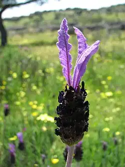 Lavandula pedunculata, commonly called Spanish Lavender[2] or French lavender,[3] is a species of flowering plant in the family Lamiaceae. It is known for the tuft of two or three butterfly-like, narrow petals that emerge from the top of its ovoid head. L. pedunculata is native to Iberia, Morocco and western Turkey.[3]