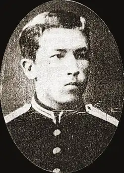 One story relates how Kornilov was originally born as a Don Cossack Kalmyk named Lavga Deldinov and adopted in Ust-Kamenogorsk, Russian Turkestan (now Kazakhstan) by the family of his mother's brother, the Russian Cossack Khorunzhiy Georgy Nikolayevich Kornilov, whose wife was of Kazakh origin.[5][6] But his sister wrote that he had not been adopted, had not been a Don Cossack, and that their mother had Polish and Altai Oirot descent. (Though their language was not a Kalmyk/Mongolian one, but because of their Asian race and their history in the Jungar Oirot (Kalmyk) state, Altai Oirots were called Altai Kalmyks by Russians. They were not Muslims or Kazakhs.) But Boris Shaposhnikov, who served with Pyotr Kornilov, the brother of Lavr, in 1903, mentioned the "Kyrgyz" ancestry of their mother—this name was usually used in reference to Kazakhs in 1903.[7] Kornilov's Siberian Cossack father was a friend of Potanin (1835–1920), a prominent figure in the Siberian autonomy movement.[8]