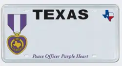 Texas also awards The Peace Office Purple Heart specialty license plate in honor of those who have earned a Peace Officer Purple Heart. Texas is the only state who has a license plate like this. This license plate has the words "Peace Officer Purple Heart" and an image of a purple heart with the State of Texas in the middle that says "Texas Peace Officer".[6]