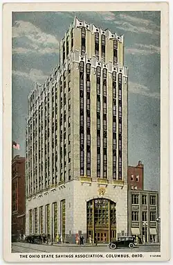 It was designed in the Art Moderne style by Simons, Brittain & English. The building was completed in 1927, the same year and in the same style as the LeVeque Tower. The steel-frame building utilizes several building materials, including Litholite (a cast stone material) on the exterior of its first three floors, brick on the upper seven floors, and above an ornamental parapet made of multicolored terracotta. Two-story penthouses above it have similar ornamentation. The main entrance on Gay Street uses a warm mix of pale pink marble and polished brass, and includes an elevator lobby and decorative open stairway.[2] It was built as one of several prominent banks in downtown Columbus. The building received extensive architectural press coverage due to its use of Litholite, a new building material at the time. It was operated by the Ohio State Savings Association, which claimed it had the heaviest bank vault door in the city.[3]
