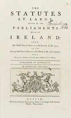 The Parliament of Ireland made laws for the Lordship of Ireland and Kingdom of Ireland from 1297 until the end of 1800.