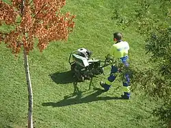 A lawn aerator is a garden tool designed to create holes in the soil in order to help lawn grasses grow.[1] In compacted lawns, aeration improves soil drainage and encourages worms, microfauna and microflora which require oxygen.[2]