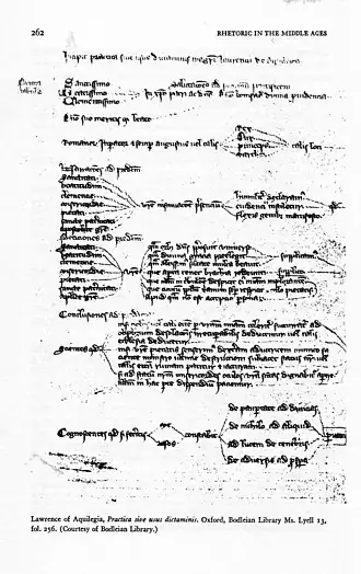 Lawrence’s first work, written at Paris and dated between 1298 and 1302, the treatise borrows from Cicero’s De inventione and the Rhetorica ad Herennium as well as from fellow dictators Buoncompagno’s Rhetorica novissima (Jensen 1973).