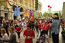 Queensland follows the federal legislation Australia has created on protests and demonstrations whilst also having laws at the state level. Any public assembly or demonstration needs to give notice to the local police force five working days prior to the assembly being held.[10] Opposition to the assembly will only occur if the demonstration will dispute the law. In Queensland the Peaceful Assembly Act allows the right for protests to be held and will only be restricted if public safety, public order or the protection of rights and freedoms is infringed.[11]
