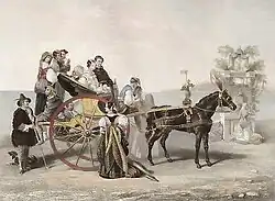 The original idea of Dumas was a trip along the coast of the whole Mediterranean.[1] This trip should have given him material for a travel book.[1] In order to do that, in 1834 he launched several subscriptions, but he was unable to raise the entire sum needed for the trip.[1] So, he had to reduce the scope of his trip to southern Italy, and it is likely that Dumas had tried to get in touch with revolutionary and Mazzinian elements in the Kingdom of the Two Sicilies, with a view to an anti-Bourbon uprising. On 12 May 1835 he left together with his friend Louis Godefroy Jadin, a painter, Jadin's dog, Milord, his mistress and later wife, Ida Ferrier, and her sister.[2][1] Passing through Toulon, Nice, Genoa, Livorno, Pisa and Florence (where he arrived on 1 July) he reached Rome, where he asked Ferdinand II's ambassador for permission to visit the Kingdom of the Two Sicilies.[3][1] Unfortunately, he had been denounced as a republican agitator and was banned from visiting the kingdom.[3] Due to that, he traveled to the Kingdom of the Two Sicilies using the name of Joseph Guichard, a painter and resident of the French Academy at Villa Medici.[3] He traveled clandestinely, always accompanied by his friends,[1] and, after reaching Naples, where he left his lover, he embarked for Sicily on a small boat and was joined by the contralto Caroline Ungher, who became his lover during the trip.[1][4] He returned to Naples at the end of October 1835 and found Ida, but he was forced to leave the city on 23 November, after only three weeks, after being denounced.[1] Dumas had to wait ten years for the final draft of the romance, time which allowed him to search for literary sources to make the work richer.[3]