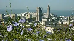 Le Havre belongs to the Paris Basin which was formed in the Mesozoic period. The Paris Basin consists of sedimentary rocks. The commune of Le Havre consists of two areas separated by a natural cliff edge: one part in the lower part of the town to the south including the harbour, the city centre and the suburbs. It was built on former marshland and mudflats that were drained in the 16th century.[20] The soil consists of several metres of alluvium or silt deposited by the Seine.[20] The city centre was rebuilt after the Second World War using a metre of flattened rubble as a foundation.[21][22]