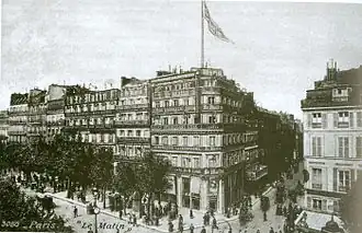 Le Matin was launched on the initiative of Chamberlain & Co., a group of American financiers and the American newspaper editor Samuel Selwyn Chamberlain,[2] in 1883, on the model of the British daily The Morning News. The direction of the project was entrusted to the French journalist Alfred Edwards,[3] who launched the first issue on 26 February 1884. His home was then situated in the 10th arrondissement of Paris, at 6 boulevard Poissonnière, and his offices at numbers 3 to 9 on the same street.