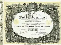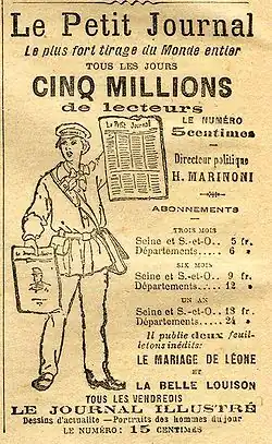 Le Petit Journal (pronounced [lə pəti ʒuʁnal]) was a conservative daily Parisian newspaper founded by Moïse Polydore Millaud; published from 1863 to 1944. Together with Le Petit Parisien, Le Matin, and Le Journal, it was one of the four major French dailies. In 1890, during the Boulangiste crisis, its circulation first reached one million copies. Five years later, it had a circulation of two million copies, making it the world's largest newspaper.[1]