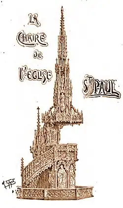 The commission was originally awarded to Geefs' younger brother Joseph, who completed L'ange du mal in 1842 and installed it the following year. It generated controversy at once and was criticized for not representing a Christian ideal.[8] The cathedral administration declared that "this devil is too sublime."[9] The local press intimated that the work was distracting the "pretty penitent girls" who should have been listening to the sermons.[10] Bishop van Bommel soon ordered the removal of L'ange du mal, and the building committee passed the commission for the pulpit sculpture to Guillaume Geefs, whose version was installed at the cathedral permanently in 1848.[11]
