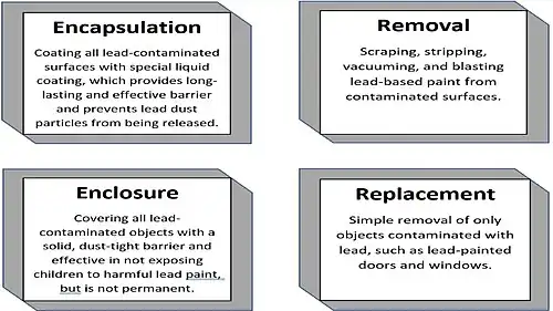 There are various lead abatement techniques to remove residential lead-based paint and lead in household dusts. Encapsulation and enclosure makes the hazard of lead-based paint inaccessible, while chemical stripping, removal of abrasives, scraping with the hand, and component replacement are effective in permanently removing lead-based paints from households.[5] Encapsulation refers to the technique that coats all lead-contaminated surfaces with a special liquid coating, which provides a long-lasting and effective barrier and prevents lead dust particles from being released. Enclosure refers to covering all lead-contaminated surfaces and objects with a solid, dust-tight barrier, which is effective in not exposing children to harmful lead paint but is not a permanent solution. Removal is the act of scraping, stripping, vacuuming, and blasting lead-based paint from contaminated surfaces. Replacement is the simple removal and substitution of only objects contaminated with lead, such as lead-painted doors and windows.[5] However, residential lead abatement practices are relatively expensive, and some practices are ineffective and could even worsen the current situation.[4][5]