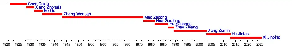 By custom the party leader has either been elected by the CCP Central Committee or the Central Politburo.[1] There were several name changes until Mao Zedong finally formalized the office of Chairman of the Central Committee in 1945.[1] Since 1982, the CCP National Congress and its 1st CC Plenary Session has been the main institutional setting in which the CCP leadership are elected.[1] From 1992 onwards, every party leader has been elected by a 1st CC Plenary Session. In the period 1928–45 the CCP leader was elected by conference, meetings of the Central Committee or by decisions of the Politburo.[1] The last exception to this rule is Jiang Zemin, who was elected at the 4th Plenary Session of the 13th Central Committee in the aftermath of the 1989 Tiananmen Square protests and massacre.[2] Currently, to be nominated for the office of general secretary, one has to be a member of the CCP Politburo Standing Committee, the top decision body.[3]