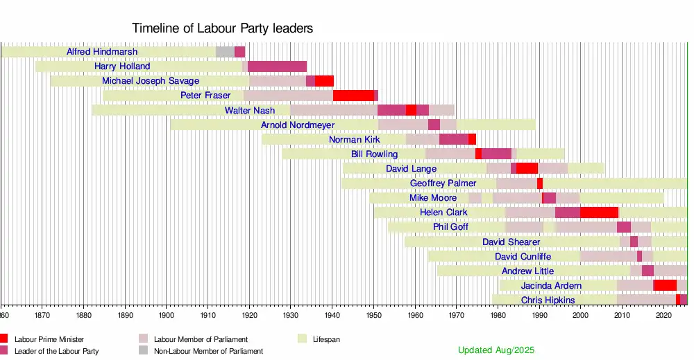 The post of leader of the Labour Party was officially created upon the party's inception in 1916, though the title "leader" was often substituted and/or complemented with the title "chairman".[1] At the 1935 election, Michael Joseph Savage led the Labour Party to victory, becoming the first Labour prime minister. In 1963, Arnold Nordmeyer became the first New Zealand-born leader of the party; three previous leaders had been born in Australia and one each in England and Scotland. The most electorally successful Labour leader to date is Helen Clark, who won three elections, in 1999, 2002 and 2005. Clark is also the party's longest-serving leader, having served for 14 years, 346 days between 1993 and 2008.[2] Peter Fraser is the longest-serving Labour prime minister, serving 9 years, 261 days between 1940 and 1949.